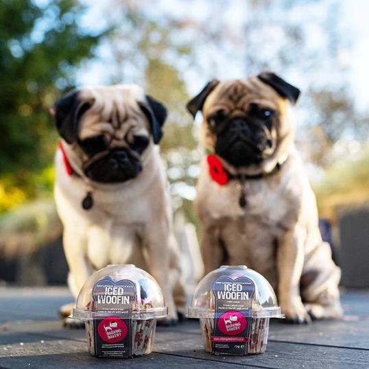 A single Carob woofin with carob frosting cake. Made to share or for the larger of our furry friends. Our light sponge topped with a tail-swishing swirl of famous yoghurt frosting and decorated with a doggy crunchy bone biscuits and edible disc in a paw print muffin wrapper.